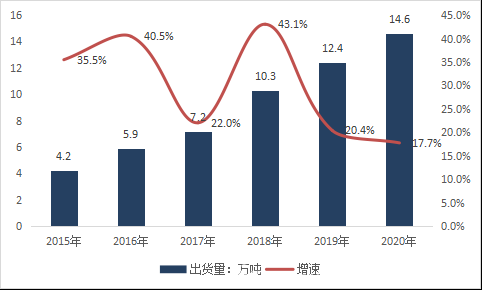 根據(jù)《中國銅箔行業(yè)發(fā)展白皮書(2021年)》數(shù)據(jù)顯示,2020年,中國鋰電銅箔出貨量達到14.6萬噸,同比增長17.7%。2015-2020年鋰電銅箔出貨量年均復(fù)合增速高達28.3%。